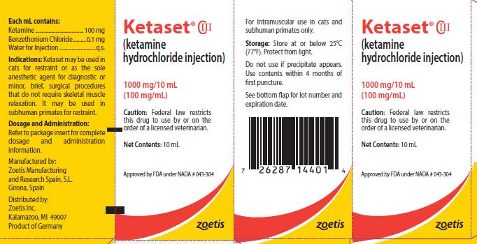 KETASET (ketamine hydrochloride injection) is a rapid-acting, nonnarcotic, nonbarbiturate agent for anesthetic use in cats and for restraint in subhuman primates. It is chemically designated dl 2-(o-chlorophenyl)-2-(methylamino) cyclohexanone hydrochloride and is supplied as a slightly acid (pH 3.5 to 5.5) solution for intramuscular injection in a concentration containing the equivalent of 100 mg ketamine base per milliliter and contains not more than 0.1 mg/mL benzethonium chloride as a preservative.
