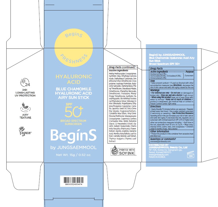 BeginS by JUNGSAEMMOOL Blue Chamomile Hyaluronic Acid Airy Sun Stick Broad Spectrum SPF 50 plus by is a Otc medication manufactured, distributed, or labeled by Jungsaemmool Beauty Co., Ltd., Cosmax, Inc.. Drug facts, warnings, and ingredients follow.