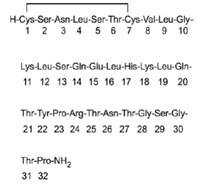 Calcitonin salmon injection, USP, synthetic is a synthetic polypeptide of 32 amino acids in the same linear sequence that is found in calcitonin of salmon origin. This is shown by the following graphic formula: