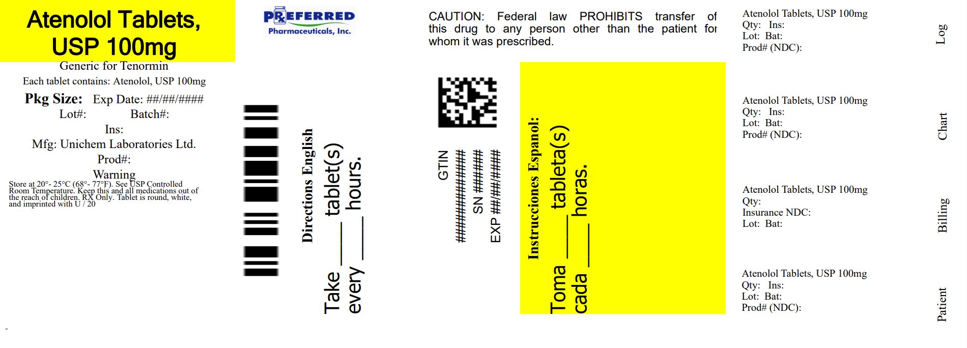 Tablets of 100 mg atenolol are white to off-white, round, flat faced bevelled edge, uncoated tablet debossed with "20" on one side and "U" on other side, supplied in bottles of: