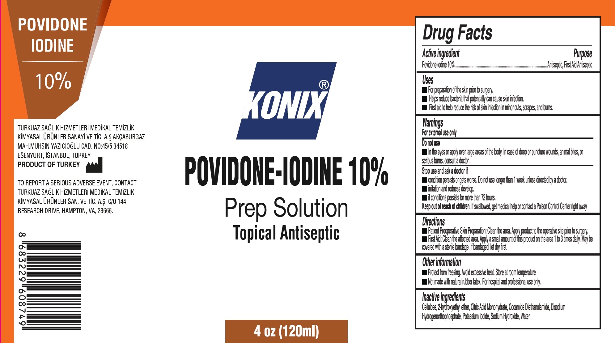 Konix Povidone Iodine Topical Antiseptic by is a Otc medication manufactured, distributed, or labeled by TURKUAZ SAGLIK HIZMETLERI MEDIKAL TEMIZLIK KIMYASAL URUNLER SANAYI VE TICARET AS. Drug facts, warnings, and ingredients follow.