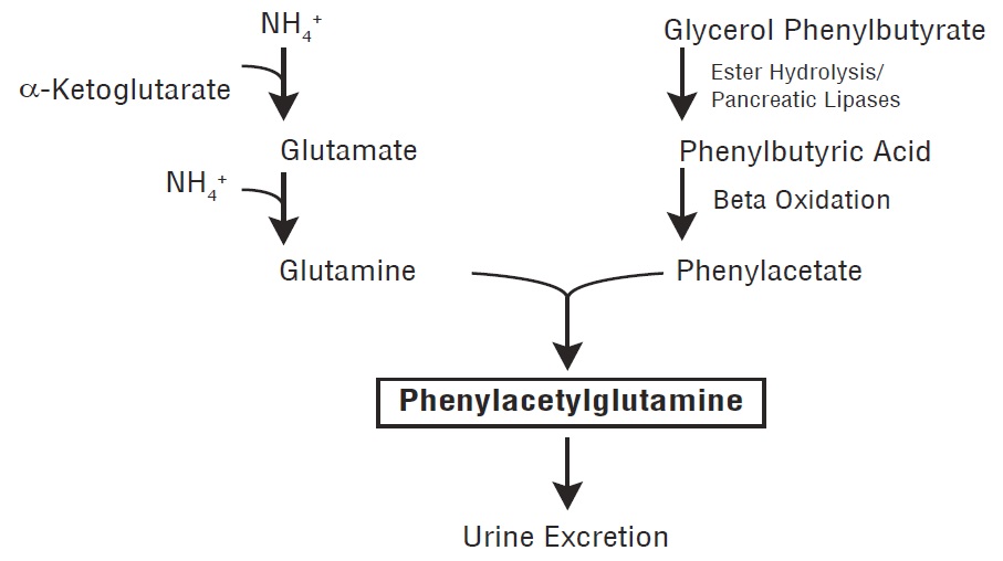 UCDs are inherited deficiencies of enzymes or transporters necessary for the synthesis of urea from ammonia (NH3, NH4+). Absence of these enzymes or transporters results in the accumulation of toxic levels of ammonia in the blood and brain of affected patients. Glycerol phenylbutyrate is a triglyceride containing 3 molecules of PBA. PAA, the major metabolite of PBA, is the active moiety of glycerol phenylbutyrate. PAA conjugates with glutamine (which contains 2 molecules of nitrogen) via acetylation in the liver and kidneys to form PAGN, which is excreted by the kidneys (Figure 1). On a molar basis, PAGN, like urea, contains 2 moles of nitrogen and provides an alternate vehicle for waste nitrogen excretion.