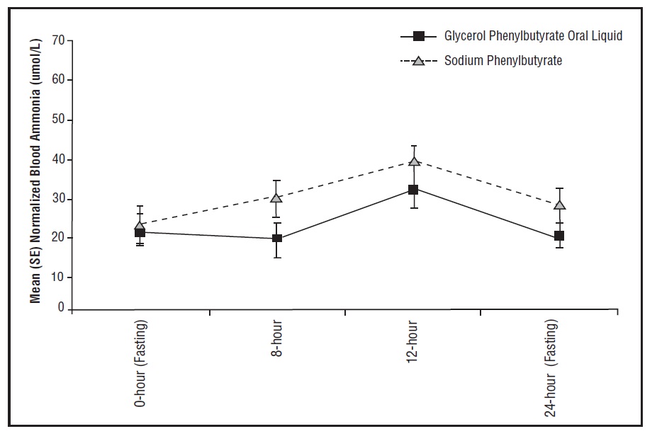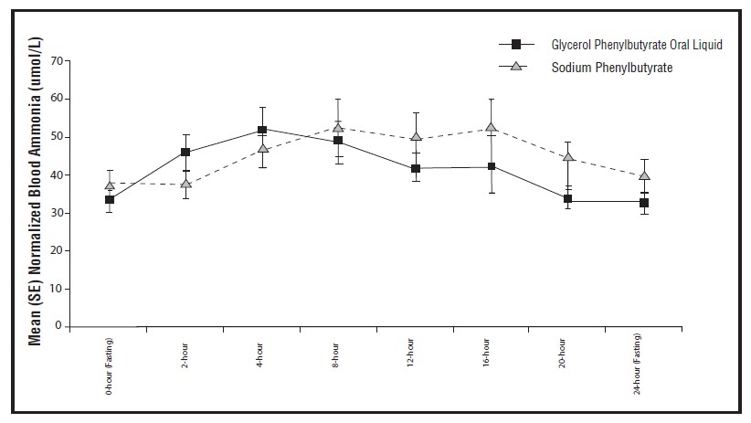 In clinical studies, total 24-hour area under the plasma concentration-time curve (AUC) of ammonia levels was comparable at steady state during the switchover period between glycerol phenylbutyrate and sodium phenylbutyrate [see Clinical Studies (14)].