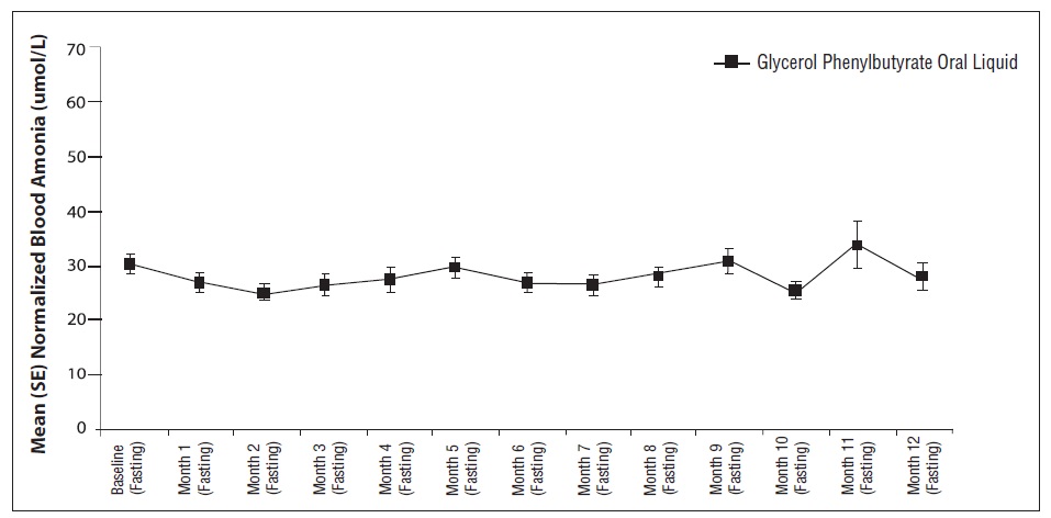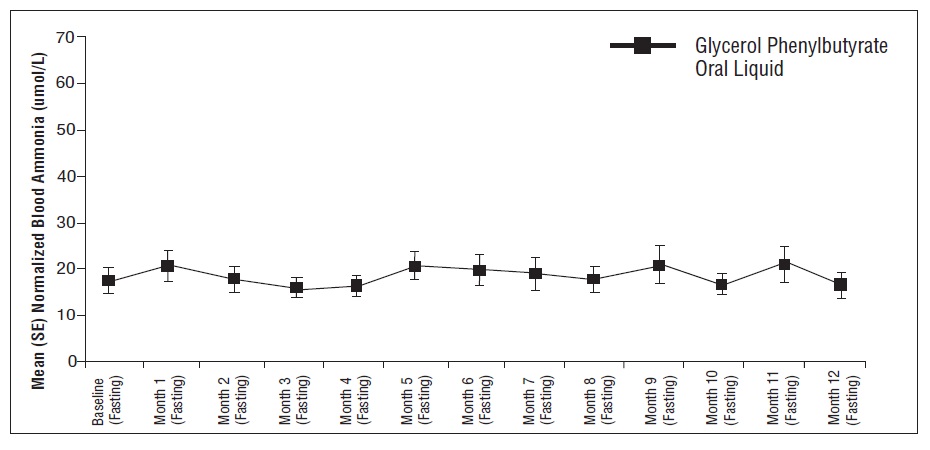 During the extension phase, venous ammonia levels were monitored monthly. Ammonia values across different laboratories were normalized (transformed) to a common normal pediatric range of 28 to 57 micromol/L for comparability. The mean normalized ammonia levels in pediatric patients at months 1, 2, 3, 4, 5, 6, 9, 12, 15, 18 and 24 were 67, 53, 78, 93, 78, 67, 38, 38, 36, 48 and 53 micromol/L during treatment with glycerol phenylbutyrate, respectively. Three patients reported a total of 7 hyperammonemic crises as defined in Study 4/4E and 5. Hyperammonemic crises were precipitated by vomiting, upper respiratory tract infection, gastroenteritis, decreased caloric intake or had no identified precipitating event (3 events). There was one additional patient who had one ammonia level that exceeded 100 micromol/L which was not associated with a hyperammonemic crisis.
