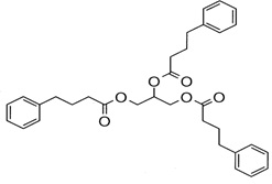 Glycerol phenylbutyrate is a nitrogen-binding agent. It is a triglyceride containing 3 molecules of PBA linked to a glycerol backbone, the chemical name of which is benzenebutanoic acid, 1', 1' ' –(1,2,3-propanetriyl) ester with a molecular weight of 530.67. It has a molecular formula of C33H38O6. The structural formula is: