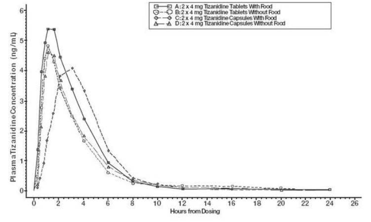 Tizanidine Capsules and Tizanidine Tablets, USP are bioequivalent to each other under fasting conditions, but not under fed conditions. A single dose of either two 4 mg tablets or two 4 mg capsules was administered under fed and fasting conditions in an open label, four period, randomized crossover study in 96 human volunteers, of whom 81 were eligible for the statistical analysis. Following oral administration of either the tablet or capsule (in the fasted state), peak plasma concentrations of tizanidine occurred 1.0 hours after dosing with a half-life of approximately 2 hours. When two 4 mg tablets were administered with food, the mean maximal plasma concentration was increased by approximately 30%, and the median time to peak plasma concentration was increased by 25 minutes, to 1 hour and 25 minutes. In contrast, when two 4 mg capsules were administered with food, the mean maximal plasma concentration was decreased by 20%, the median time to peak plasma concentration was increased 2 to 3 hours. Consequently, the mean Cmax for the capsule when administered with food is approximately 66% the Cmax for the tablet when administered with food.