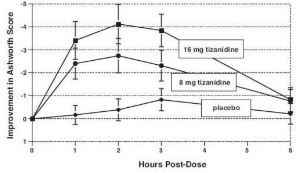 Assessments were made at 1, 2, 3 and 6 hours after treatment. A statistically significant reduction of the Ashworth score for Tizanidine Tablets, USP compared to placebo was detected at 1, 2 and 3 hours after treatment. Figure 2 below shows a comparison of the mean change in muscle tone from baseline as measured by the Ashworth scale. The greatest reduction in muscle tone was 1 to 2 hours after treatment. By 6 hours after treatment, muscle tone in the 8 and 16 mg Tizanidine Tablets, USP groups was indistinguishable from muscle tone in placebo treated patients. Within a given patient, improvement in muscle tone was correlated with plasma concentration. Plasma concentrations were variable from patient to patient at a given dose. Although 16 mg produced a larger effect, adverse events including hypotension were more common and more severe than in the 8 mg group. There were no differences in the number of spasms occurring in each group.