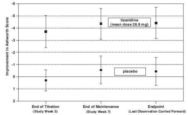 Three double-blind, randomized, placebo controlled -clinical studies were conducted to evaluate the effect of tizanidine on spasticity control. Two studies were conducted in patients with multiple sclerosis and one in patients with spinal cord injury. Each study had a 13-week active treatment period which included a 3-week titration phase to the maximum tolerated dose up to 36 mg/day in three divided doses, a 9-week plateau phase where the dose of tizanidine was held constant and a 1-week dose tapering. In all, 264 patients received tizanidine and 261 patients received placebo. Across the three studies patient ages ranged from 15–69 years and 51.4 percent were women. The median dose during the plateau phase ranged from 20–28 mg/day.