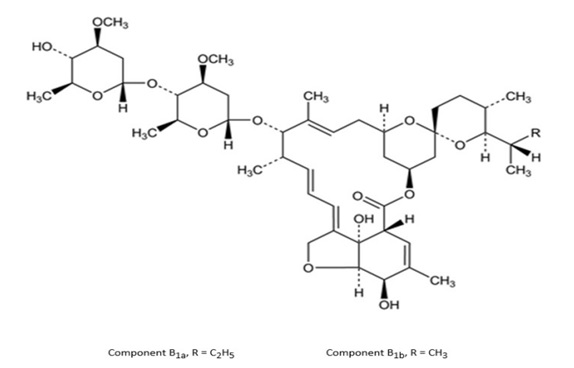 Ivermectin, USP is a semisynthetic, anthelmintic agent for oral administration. Ivermectin is derived from the avermectins, a class of highly active broad-spectrum, anti-parasitic agents isolated from the fermentation products of Streptomyces avermitilis. Ivermectin is a mixture containing at least 90% 5-O-demethyl-22,23-dihydroavermectin A1a and less than 10% 5-O-demethyl-25-de(1-methylpropyl)-22,23-dihydro-25-(1-methylethyl)avermectin A1a, generally referred to as 22,23-dihydroavermectin B1a and B1b, or H2B1a and H2B1b, respectively. The respective empirical formulas are C48H74O14 and C47H72O14, with molecular weights of 875.10 and 861.07, respectively. The structural formulas are: