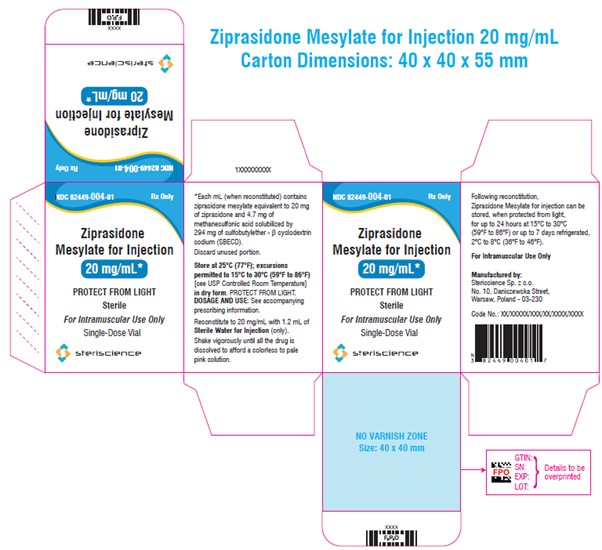 Ziprasidone mesylate for injection is available in a single-dose vial as ziprasidone mesylate (20 mg ziprasidone/mL when reconstituted according to label instructions) [ see Dosage and Administration (2.4) ]. Each mL of ziprasidone mesylate for injection (when reconstituted) contains 20 mg of ziprasidone and 4.7 mg of methanesulfonic acid solubilized by 294 mg of sulfobutylether β-cyclodextrin sodium (SBECD).