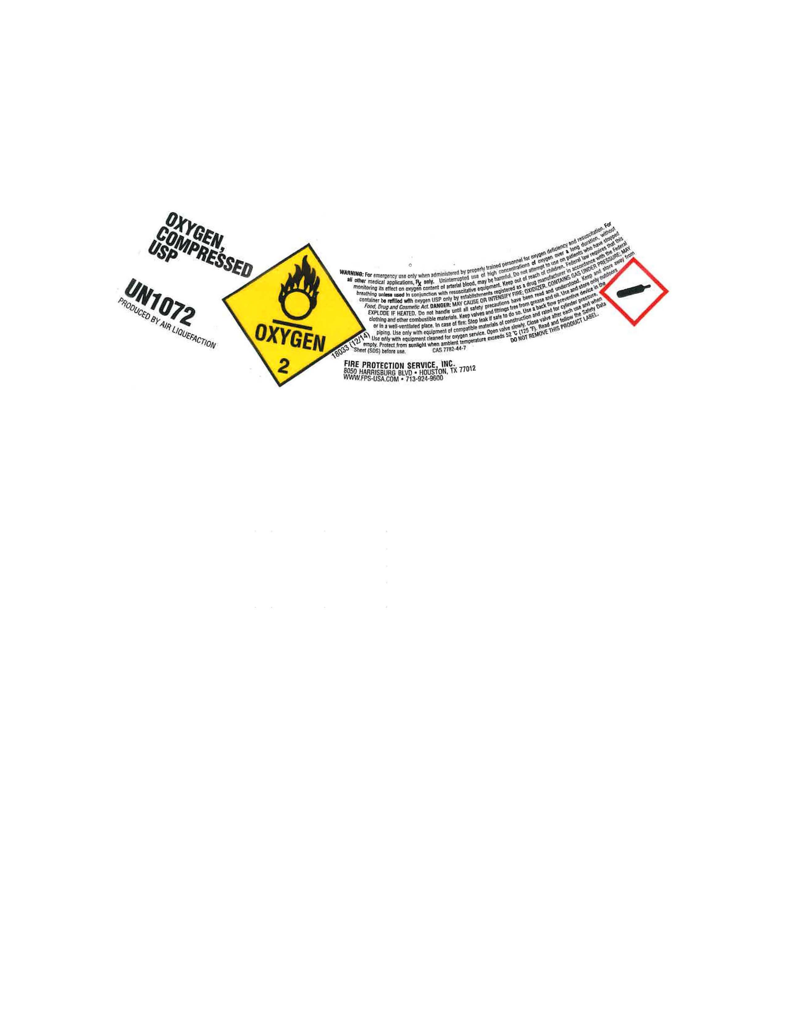 For emergency use only when administered by properly trained personnel for oxygen deficiency and resuscitation. For all other medical applications, Rx ONLY. Uninterrupted use of high concentrations of oxygen over a long duration, without monitoring its effect on oxygen content of arterial blood, may be harmful. Do not attempt to use on patients who have stopped breathing unless used in conjuction with resuscitative equipment. Keep out of reach of children. Federal law requires that this container be refilled with oxygen USP only by establishments registered as a drug manufacturer in accordance with the Federal Food, Drug and cosmetic Act. DANGER: MAY CAUSE OR INTENSIFY FIRE; OXIDIZER CONTAINS GAS UNDER PRESSURE; MAY EXPLODE IF HEATED. Do not handle until all safety precaustions have been read and understood. Keep and store away from clothing and other combustible materials. Keep valves and fittings free from grease and oil. Use and store only outdoors or in a well-ventilated place. In case of fire, stop leak if safe to do so. UUse a back flow preventive device in the piping. Use only with equipment of combustible materials of construction and rated for cylinder pressure. Use only with equipment cleaned for Oxygen service and rated for cylinder pressure. Open valve slowly. Close valve after each use and when empty. Protect from sunlight when ambient temperature exceeds 52 C (125F). Read and follow the Safety Data Sheet (SDS) before use. CAS 7782-44-7 DO NOT REMOVE THIS PRODUCT LABEL.