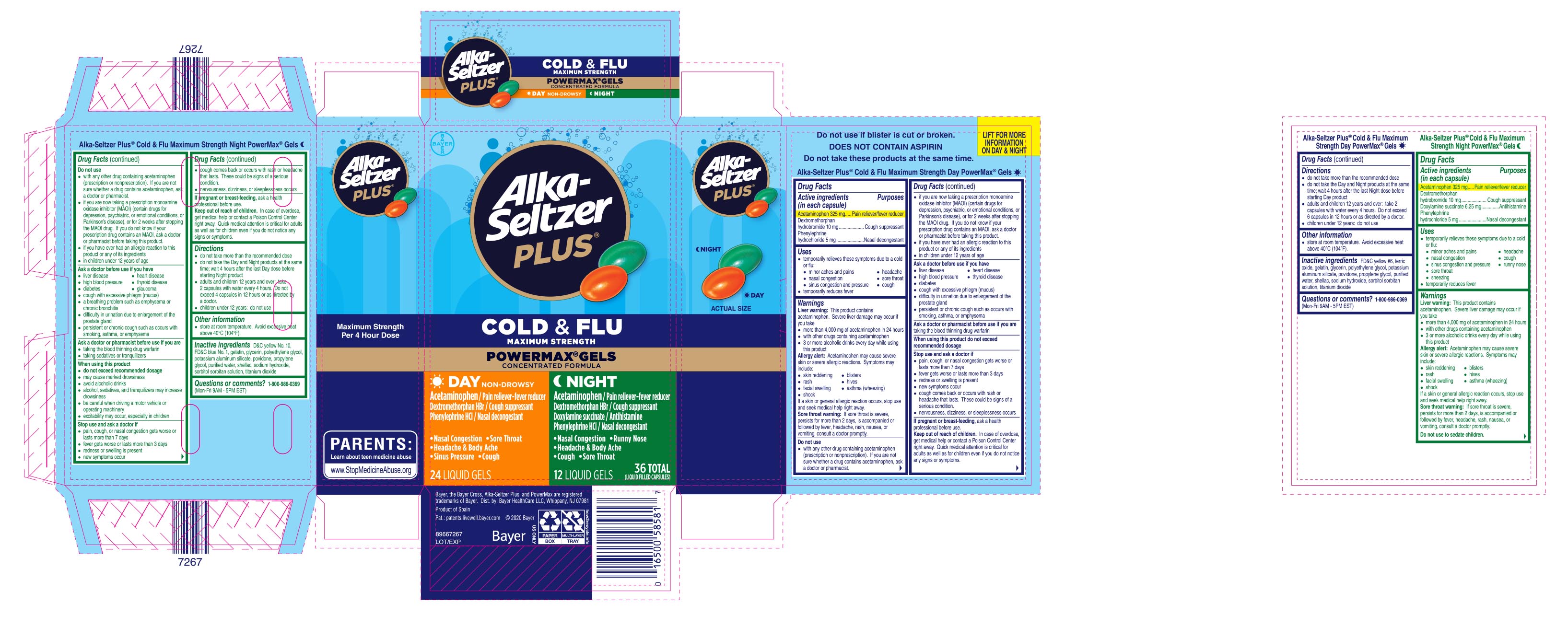 Alka-Seltzer Plus Maximum Strength Day and Night Cold and Flu PowerMax Gels by is a Otc medication manufactured, distributed, or labeled by Bayer HealthCare LLC.. Drug facts, warnings, and ingredients follow.