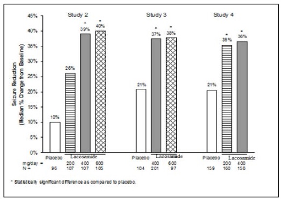 A reduction in 28-day seizure frequency (baseline to maintenance phase), as compared to the placebo group, was the primary variable in all three adjunctive therapy trials. A statistically significant effect was observed with lacosamide treatment (Figure 1) at doses of 200 mg/day (Study 4), 400 mg/day (Studies 2, 3, and 4), and 600 mg/day (Studies 2 and 3).