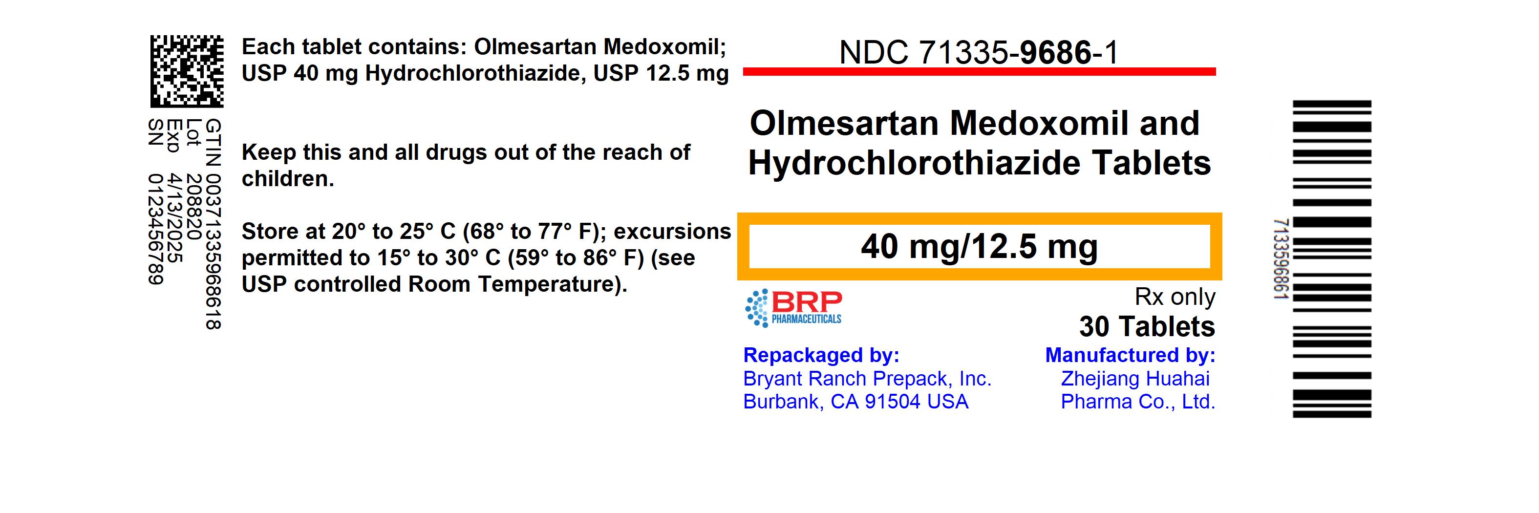 OLMESARTAN MEDOXOMIL and HYDROCHLOROTHIAZIDE by is a Prescription medication manufactured, distributed, or labeled by Bryant Ranch Prepack. Drug facts, warnings, and ingredients follow.
