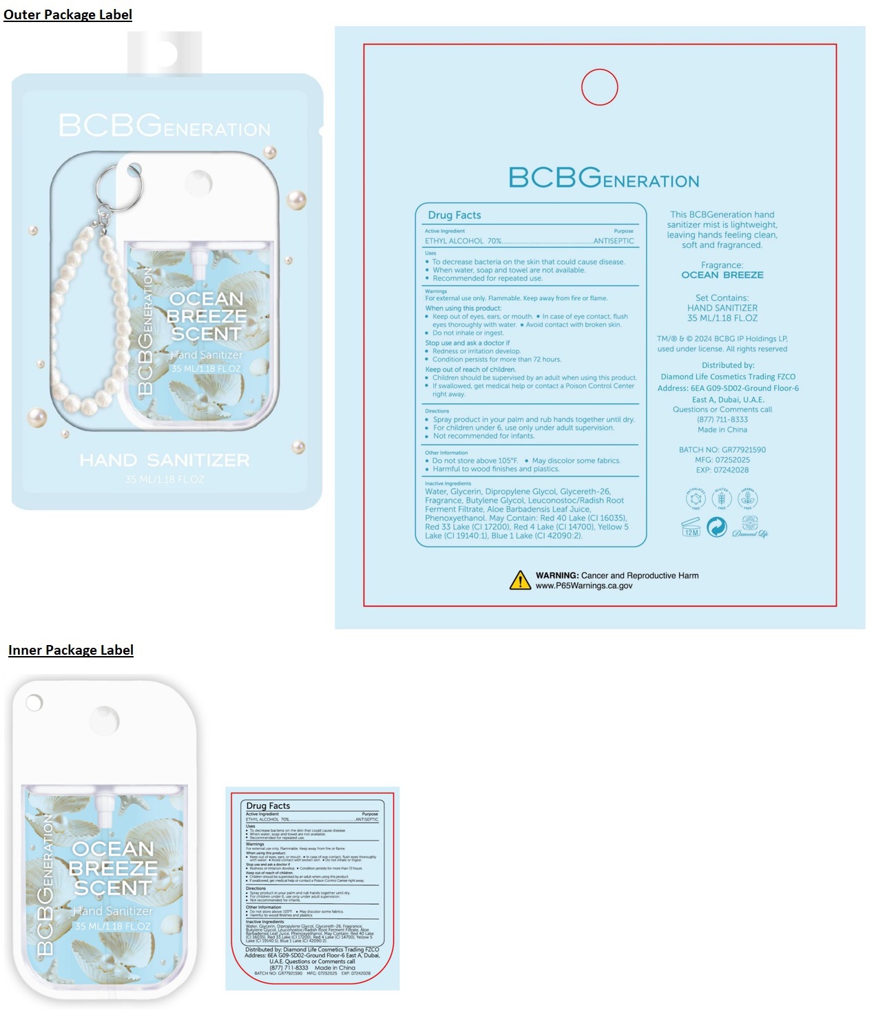 BCBGENERATION Hand Sanitizer OCEAN BREEZE SCENT by is a Otc medication manufactured, distributed, or labeled by Diamond Life Cosmetics Trading FZCO. Drug facts, warnings, and ingredients follow.