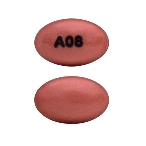 8 mcg – Oval, opaque pink soft gelatin capsule printed with A08 on the outer shell in black ink, in: