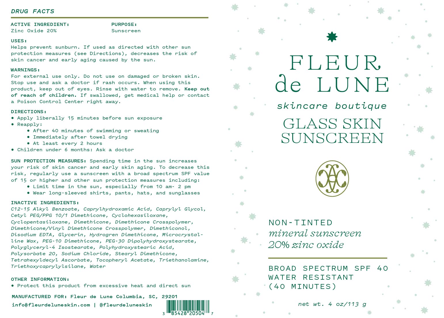 Glass Skin Sunscreen Non-Tinted by is a Otc medication manufactured, distributed, or labeled by Fleur de Lune, LLC, Custom Analytics LLC, Fragrance Manuafcturing Inc., Fallien Cosmeceuticals Ltd.. Drug facts, warnings, and ingredients follow.