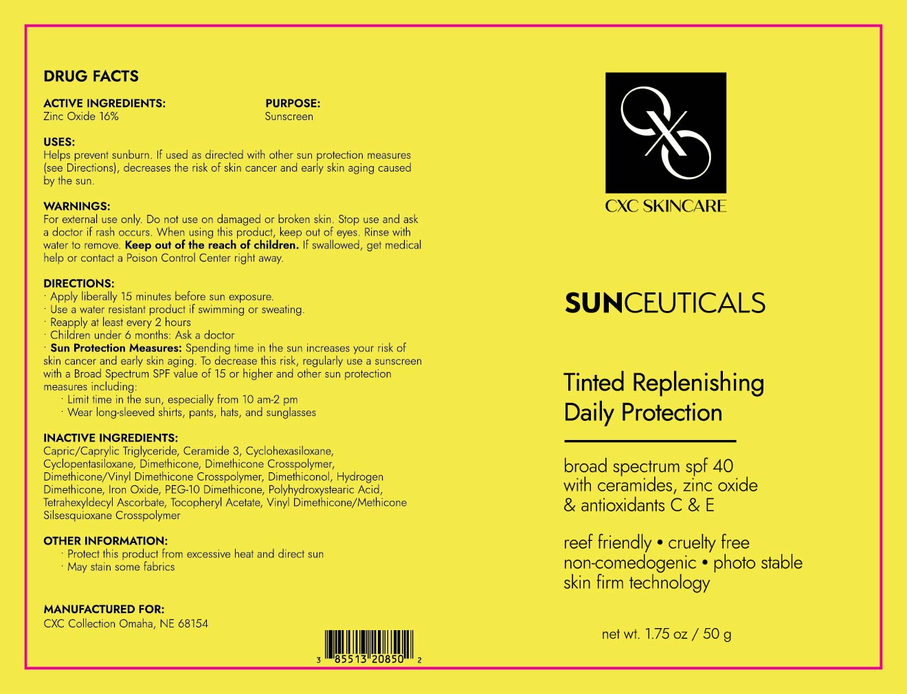 Tinted Replenishing Daily Protection by is a Otc medication manufactured, distributed, or labeled by THE AESTHETICS ACADEMY, LLC, Custom Analytics LLC, Fragrance Manufacturing Inc., Fallien Cosmeceuticals Ltd.. Drug facts, warnings, and ingredients follow.