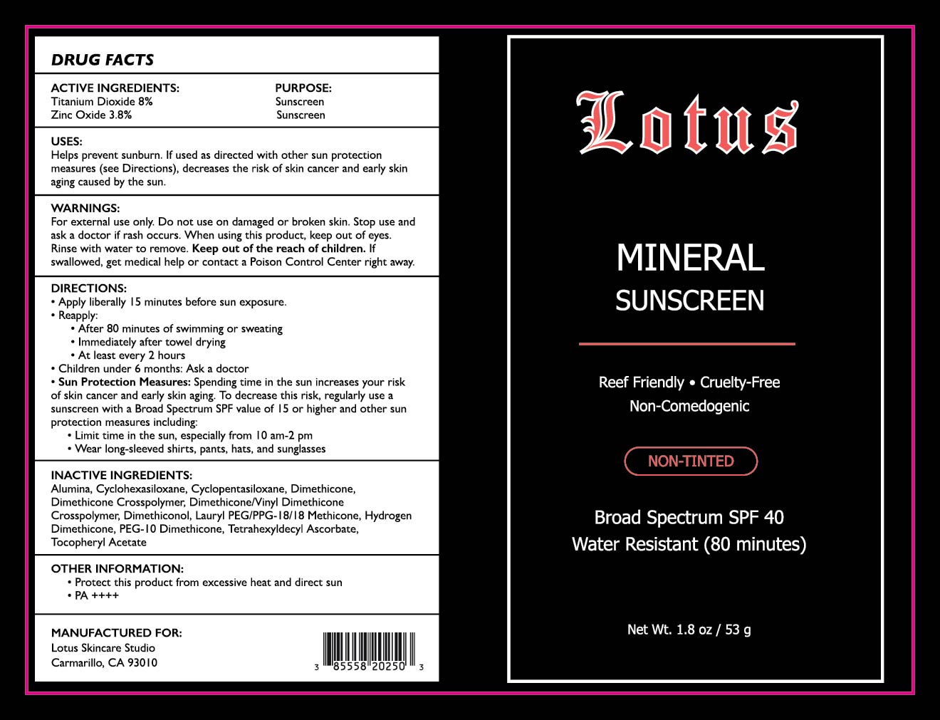 Mineral Sunscreen Non-Tinted by is a Otc medication manufactured, distributed, or labeled by LOTUS SKINCARE AND MAKE-UP STUDIO, Custom Analytics LLC, Fragrance Manufacturing Inc., Fallien Cosmeceuticals Ltd.. Drug facts, warnings, and ingredients follow.