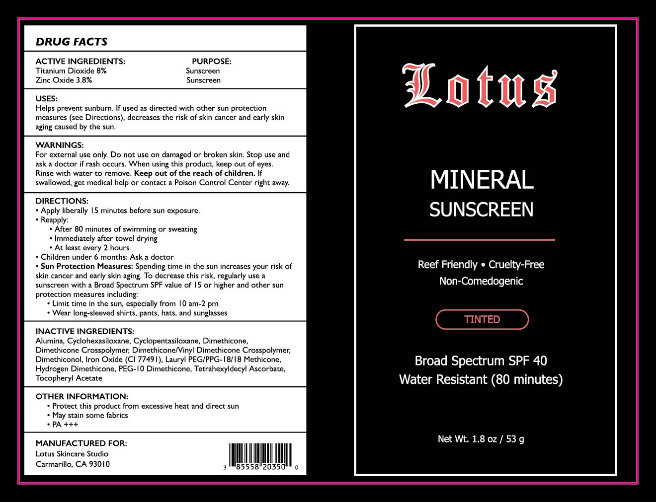 Mineral Sunscreen Tinted by is a Otc medication manufactured, distributed, or labeled by LOTUS SKINCARE AND MAKE-UP STUDIO, Custom Analytics LLC, Fragrance Manufacturing Inc., Fallien Cosmeceuticals Ltd.. Drug facts, warnings, and ingredients follow.