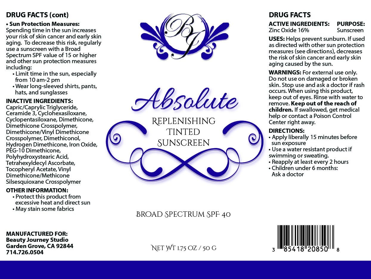 Replenishing Tinted Sunscreen by is a Otc medication manufactured, distributed, or labeled by Beauty Journey Studio LLC, Custom Analytics LLC, Fragrance Manufacturing INC, Fallien Cosmeceuticals Ltd.. Drug facts, warnings, and ingredients follow.