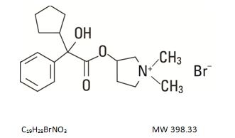 Glycopyrrolate is a quaternary ammonium salt with the following chemical name: 3[(cyclopentylhydroxyphenylacetyl)oxy]-1,1-dimethyl pyrrolidinium bromide. The molecular formula is C19H28BrNO3 and the molecular weight is 398.33.