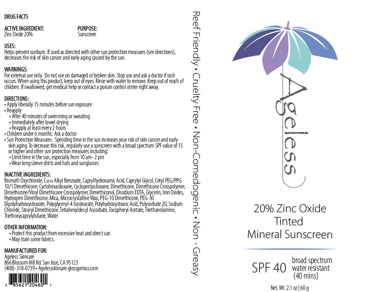 20 Zinc Oxide Tinted Mineral Sunscreen by is a Otc medication manufactured, distributed, or labeled by AGELESS SKINCARE INC, Custom Analytics LLC, Fragrance Manufacturing Inc, Fallien Cosmeceuticals Ltd.. Drug facts, warnings, and ingredients follow.