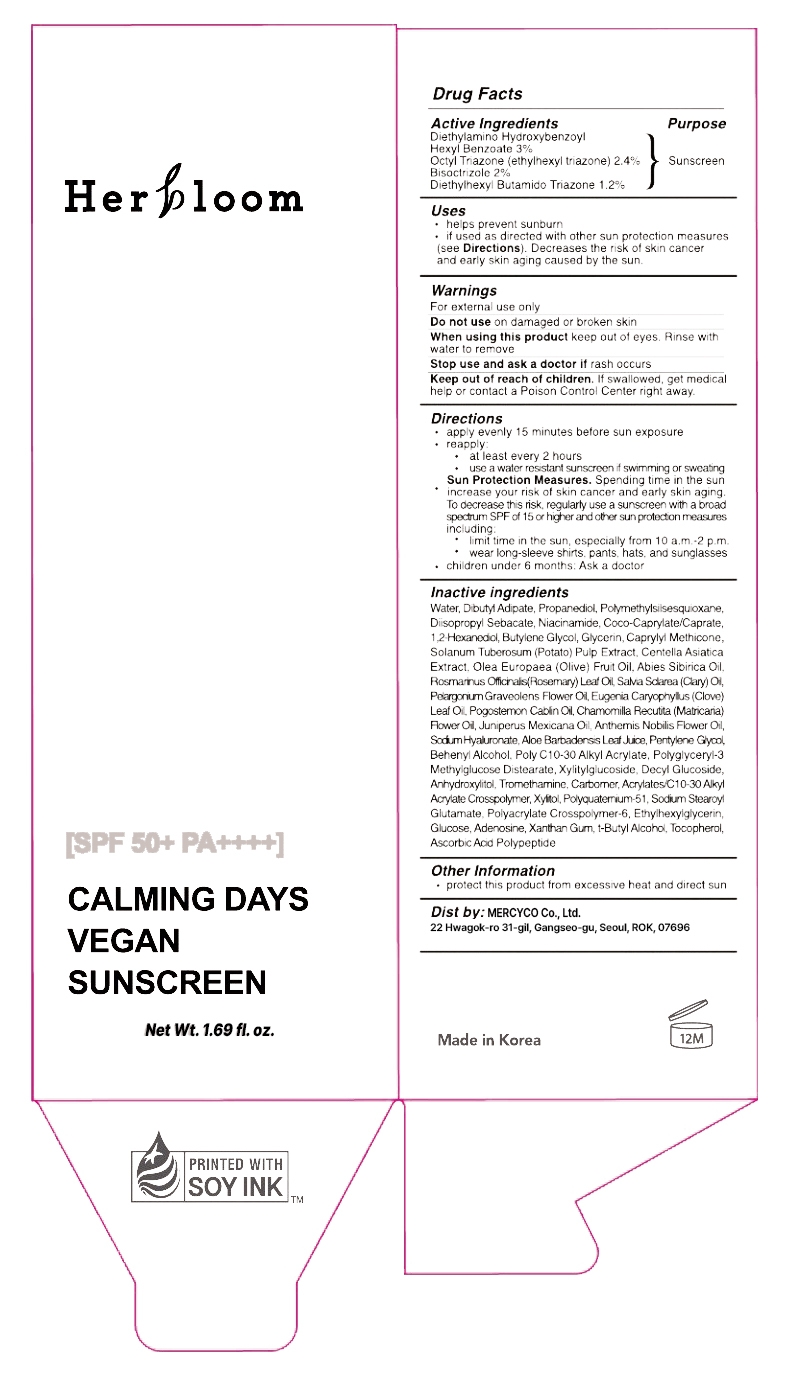 Calming Days Vegan Sunscreen by is a Otc medication manufactured, distributed, or labeled by MERCYCO Co., Ltd.. Drug facts, warnings, and ingredients follow.