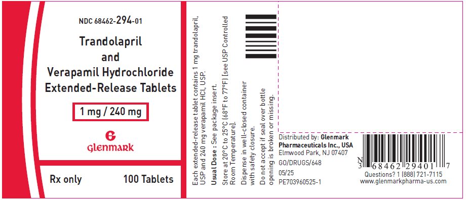 Trandolapril and Verapamil Hydrochloride Extended-Release Tablets, 1 mg/240 mg are supplied as white to pinkish white colored, oval, biconvex, film-coated tablets with ‘294’ debossed on one side and plain on the other side containing 1 mg trandolapril, USP in an immediate-release form and 240 mg verapamil hydrochloride, USP in an extended-release form.
