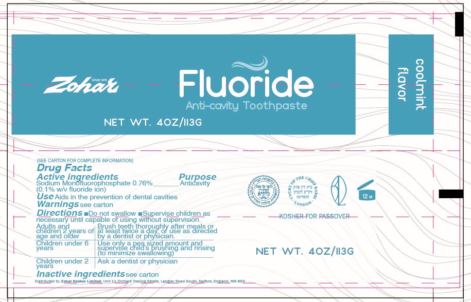 Zohar Fluoride Anti Cavity Coolmint Flavour by is a Otc medication manufactured, distributed, or labeled by ZOHAR KOSHER LIMITED. Drug facts, warnings, and ingredients follow.