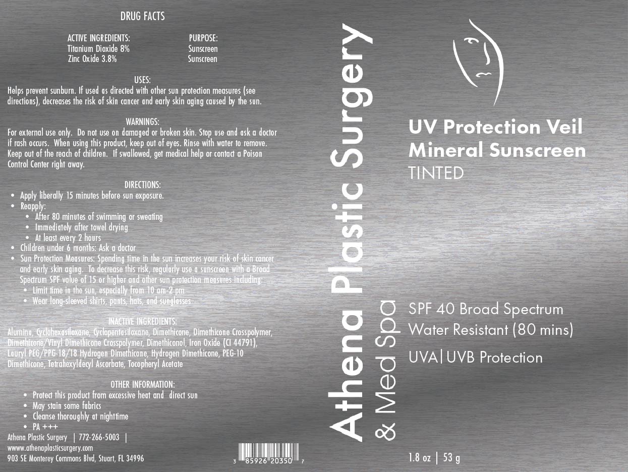 UV Protection Veil Mineral Sunscreen, tinted by is a Otc medication manufactured, distributed, or labeled by ATHENA PLASTIC SURGERY, Custom Analytics LLC, Fragrance Manufacturing Inc, Fallien Cosmeceuticals Ltd.. Drug facts, warnings, and ingredients follow.