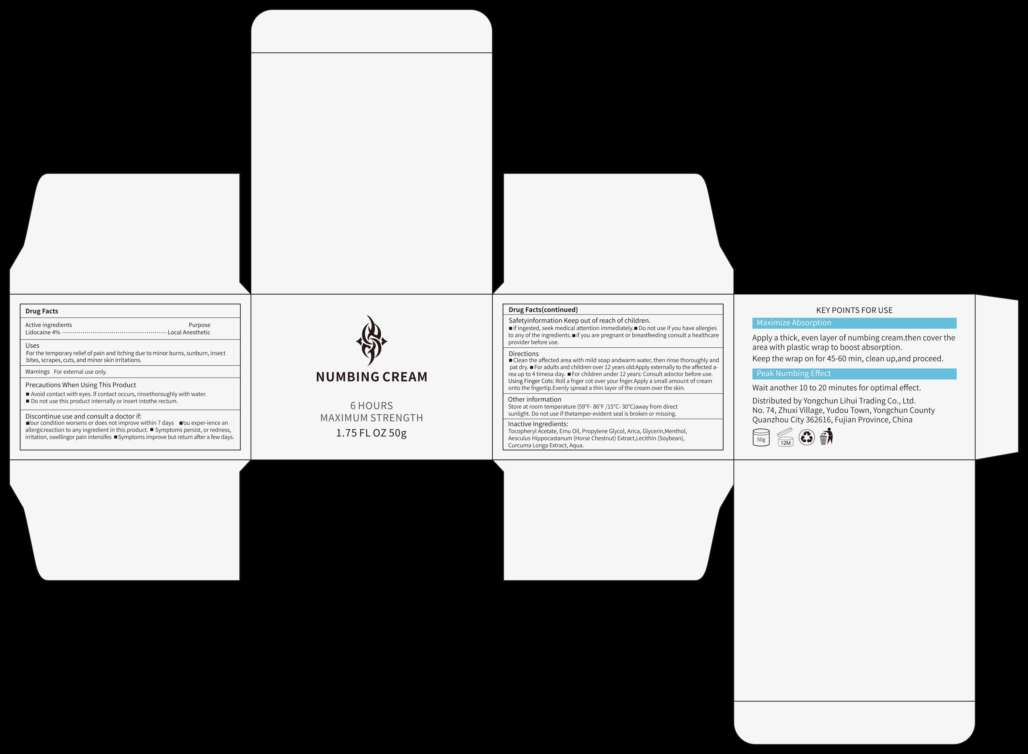 NUMBING CREAMS by is a Otc medication manufactured, distributed, or labeled by Yongchun Lihui Trading Co., Ltd.. Drug facts, warnings, and ingredients follow.