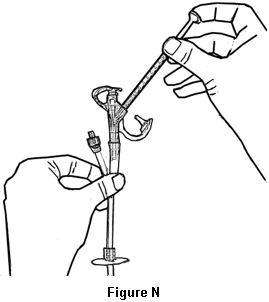 See “Important information about giving SYNDROS oral solution through a feeding tube.” Step 1: Place the oral syringe into the feeding tube. Slowly push down the plunger until the oral syringe is empty (See Figure N). If your prescribed dose is more than 1 mL, repeat Steps 4-8 in “How to prepare a dose of SYNDROS oral solution after the adapter is inserted” to draw up the remaining dose until the prescribed dose is given. For example, if your prescribed dose is 1.6 mL, take a 1 mL dose first, then an additional dose of 0.6 mL. | |