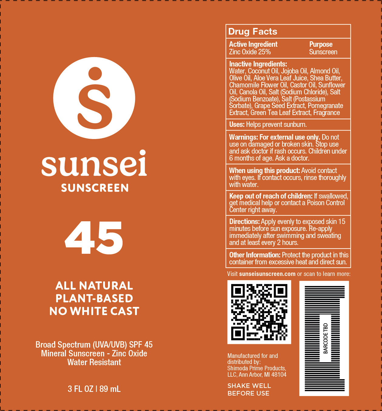 Sunsei SPF 45 Sunscreen by is a Otc medication manufactured, distributed, or labeled by Shimoda Prime Products, LLC, Southeast Holdings Corp. Drug facts, warnings, and ingredients follow.