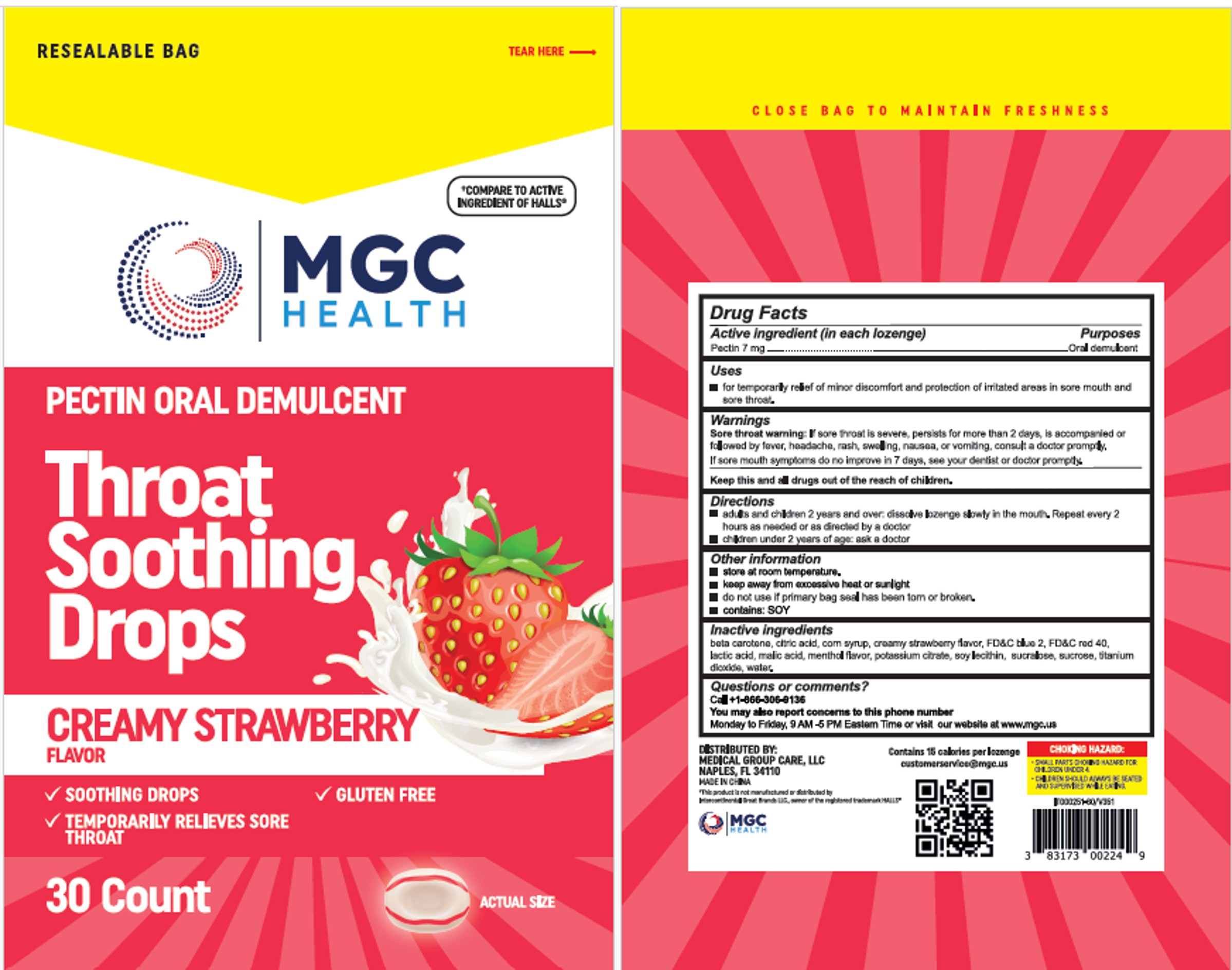 MGC Health Throat Soothing Drops Creamy Strawberry by is a Otc medication manufactured, distributed, or labeled by Medical Group Care LLC. Drug facts, warnings, and ingredients follow.