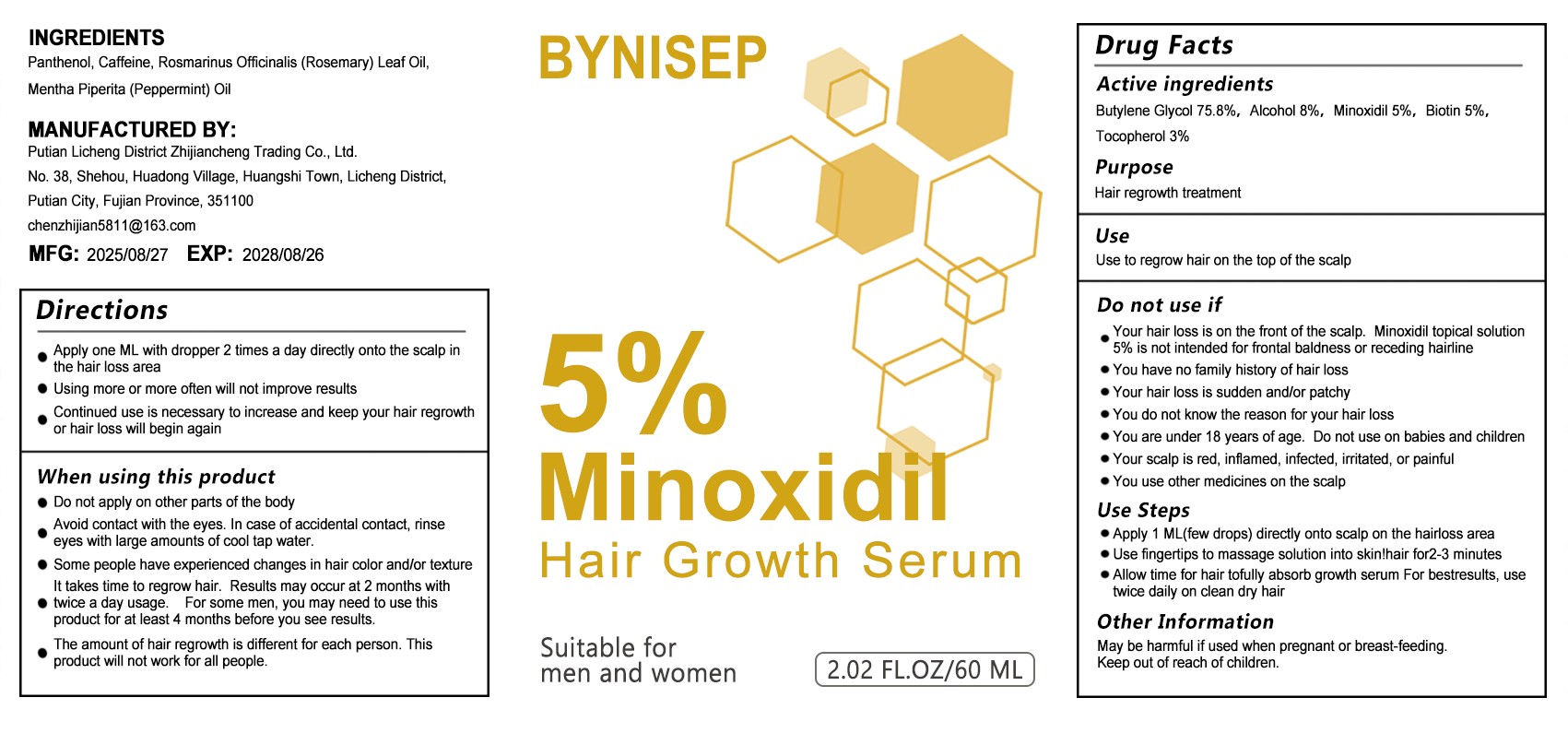 BYNISEP 5% MINOXIDIL HAIR GROWTH SERUM by is a Otc medication manufactured, distributed, or labeled by Putian Licheng District Zhijiancheng Trading Co., Ltd.. Drug facts, warnings, and ingredients follow.