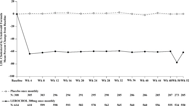 The primary efficacy outcome measure in Trial 2 was the percent change in LDL-C from baseline compared to placebo to Week 52. The difference between the LEROCHOL and placebo groups by ITT analysis in mean percentage change in LDL-C from baseline to Week 52 was -50% (95% CI: -54.2%, -45.2%; p < 0.0001). For additional results, see Table 4 and Figure 2.