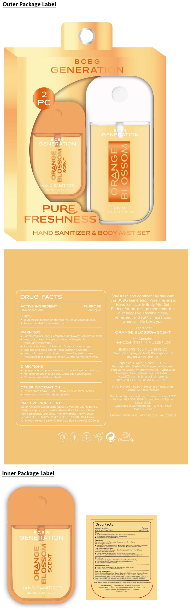 BCBG GENERATION HAND SANITIZER ORANGE BLOSSOM SCENT by is a Otc medication manufactured, distributed, or labeled by Diamond Life Cosmetics Trading FZCO. Drug facts, warnings, and ingredients follow.