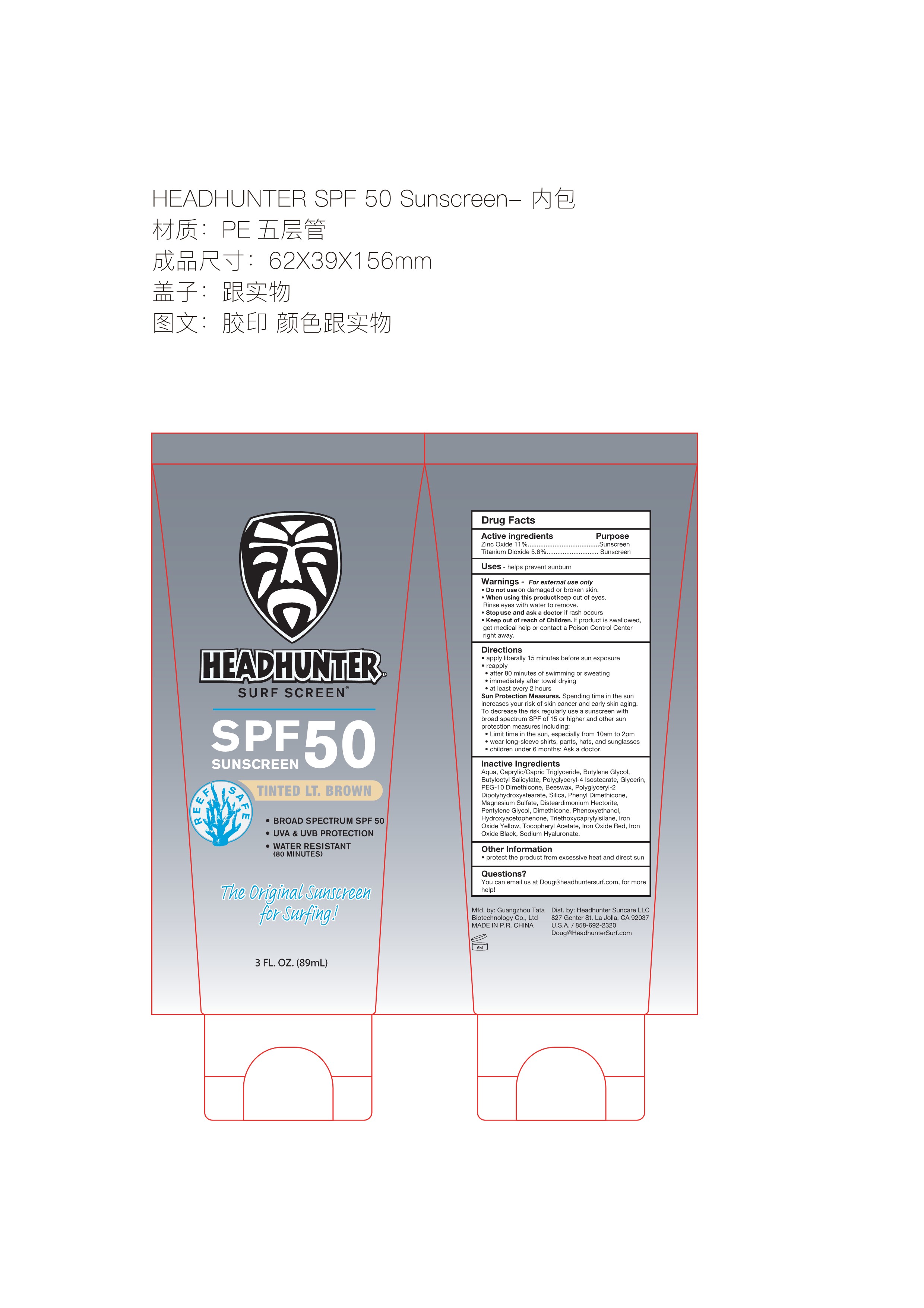 HEADHUNTER SURF SCREEN SPF 50 SUNSCREEN by is a Otc medication manufactured, distributed, or labeled by Guangzhou Tata Biotechnology Co., Ltd.. Drug facts, warnings, and ingredients follow.