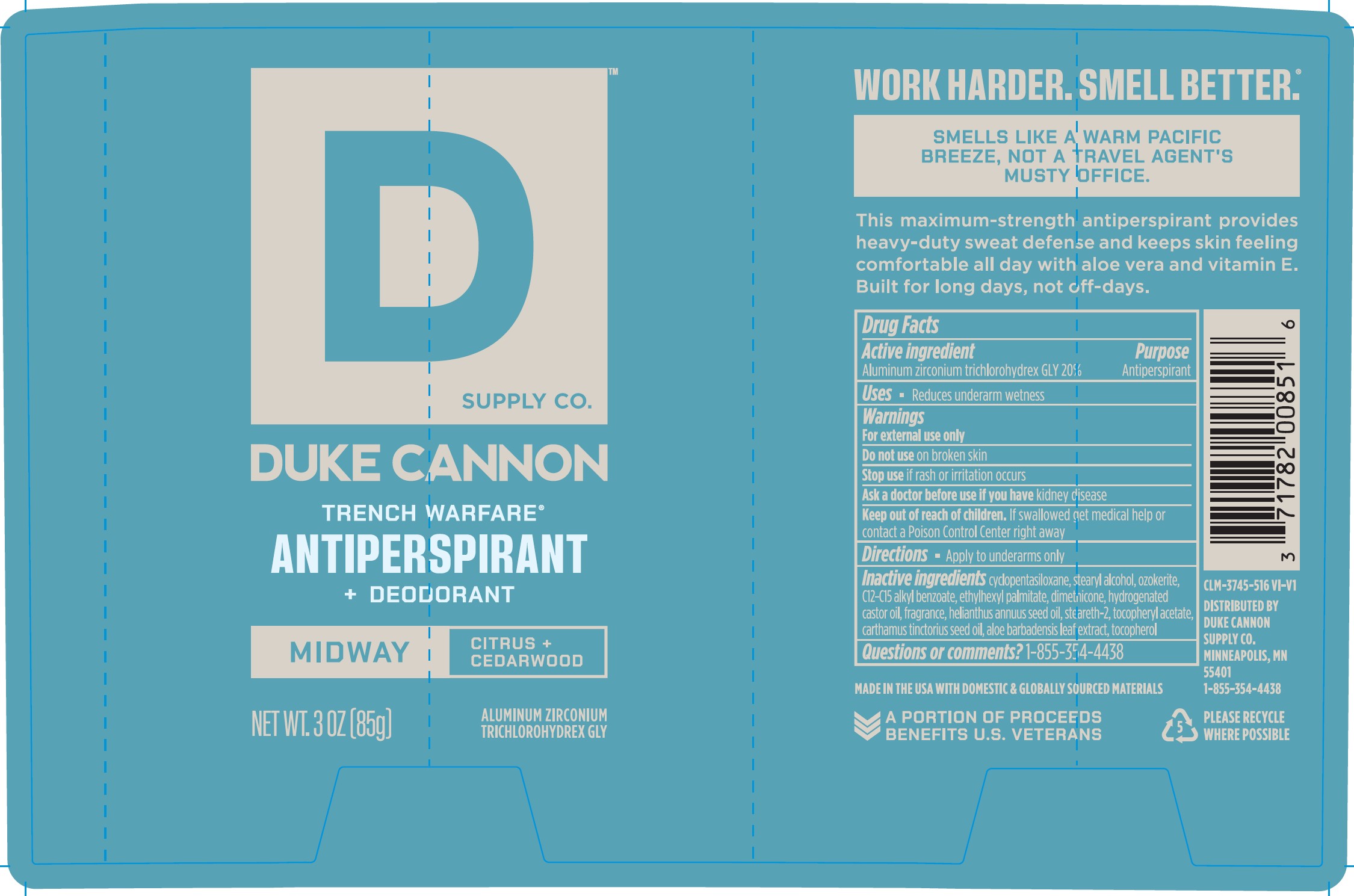 Trench Warfare Antiperspirant Deodorant Midway by is a Otc medication manufactured, distributed, or labeled by Duke Cannon Supply Co.. Drug facts, warnings, and ingredients follow.