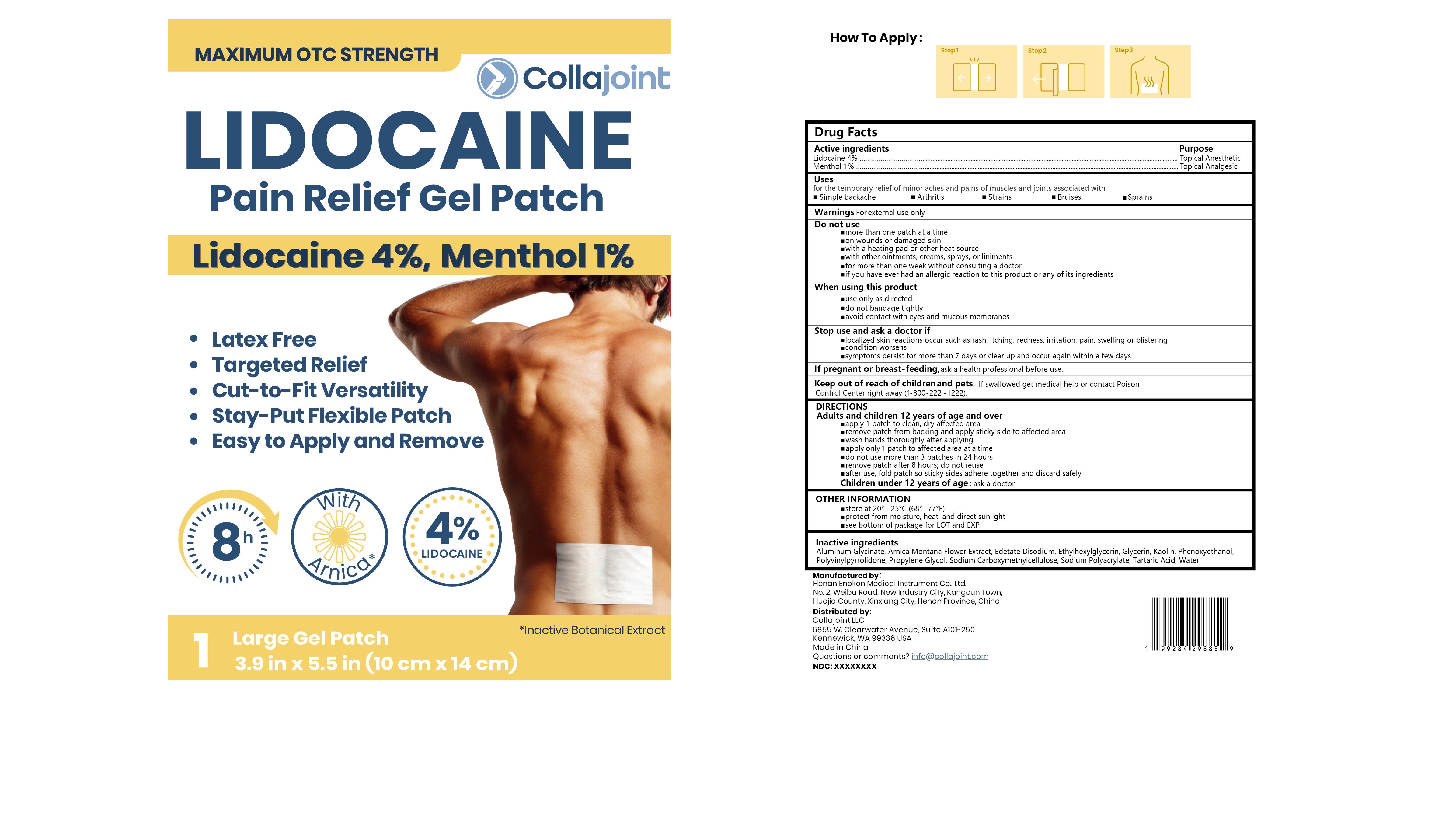 Collajoint Lidocaine Pain Relief Gel Patch by is a Otc medication manufactured, distributed, or labeled by Henan Enokon Medical Instrument Co., Ltd.. Drug facts, warnings, and ingredients follow.