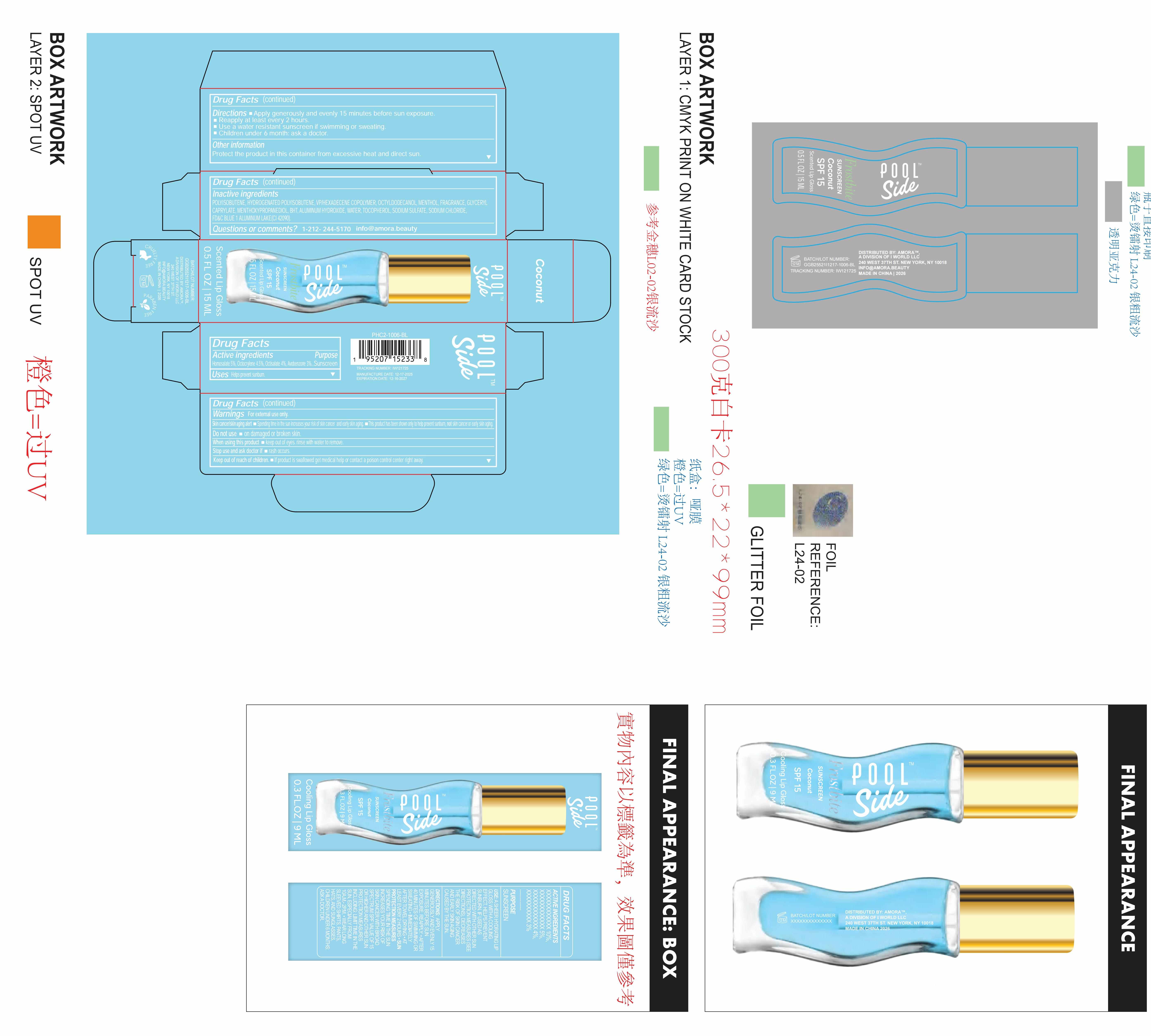 Poolside Frostbite Sunscreen coconut SPF 15 Scented lip gloss by is a Otc medication manufactured, distributed, or labeled by Longway Technology(Guangzhou)Co.,Ltd.. Drug facts, warnings, and ingredients follow.