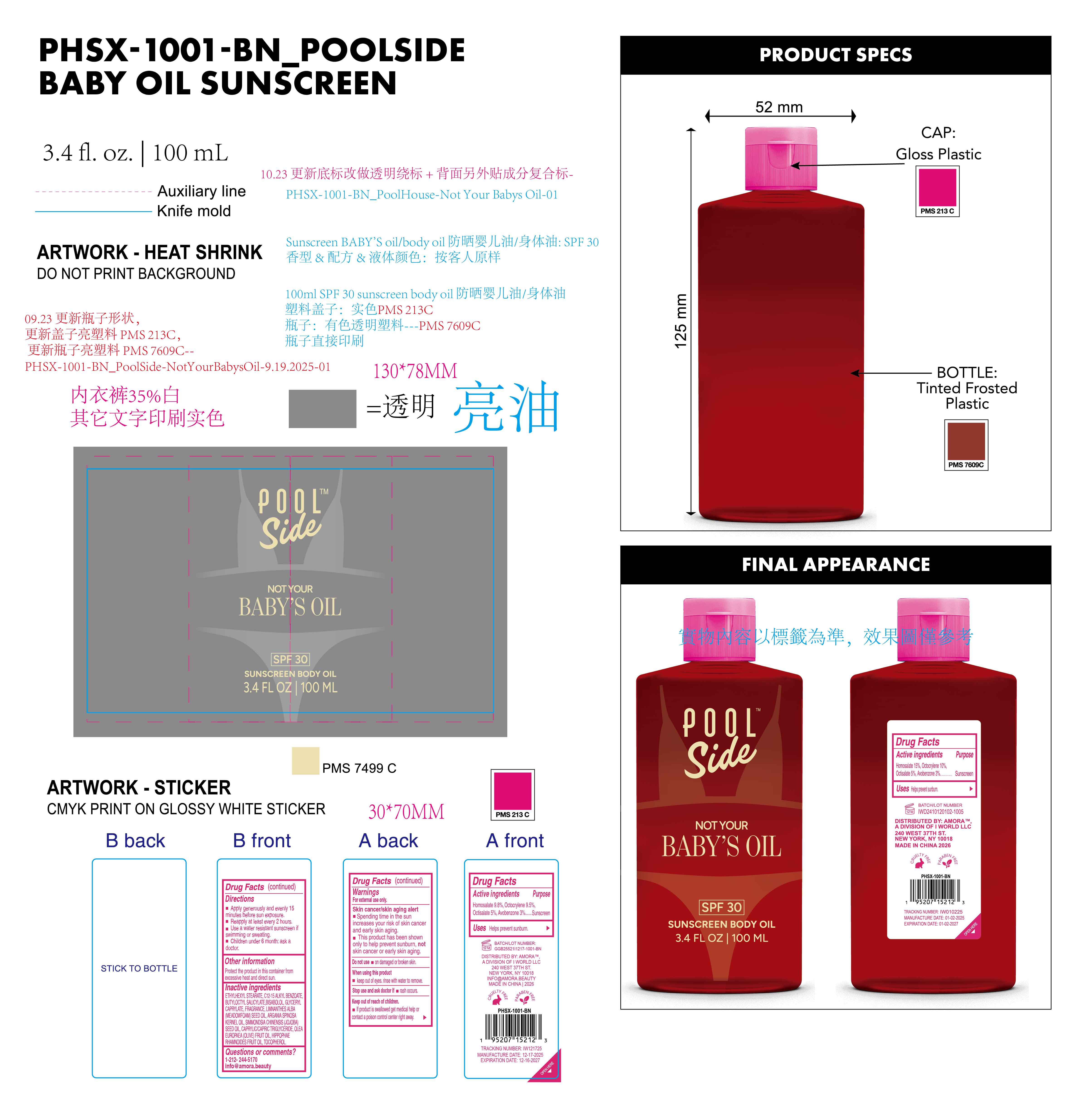 Poolside Not Your Babys Oil. SPF 30 sunscreen body oil. by is a Otc medication manufactured, distributed, or labeled by Longway Technology(Guangzhou)Co.,Ltd.. Drug facts, warnings, and ingredients follow.