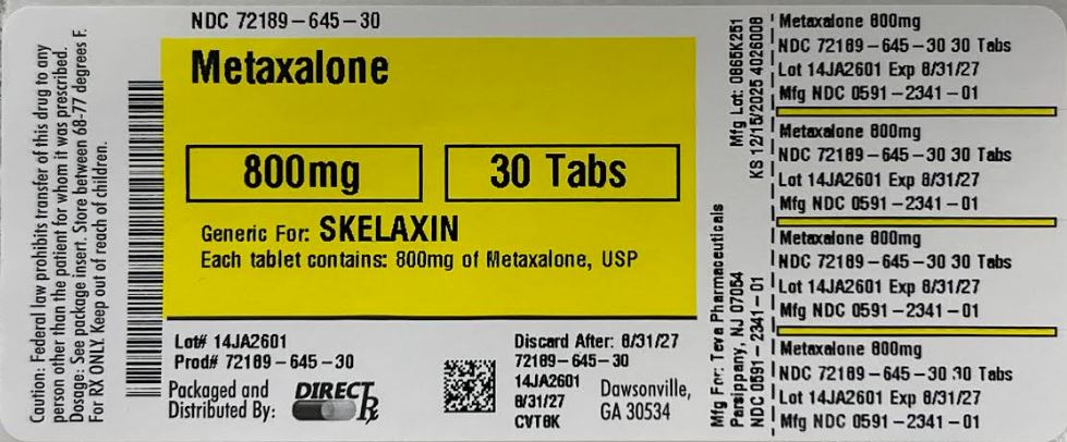 Metaxalone tablets, USP are available as 800 mg capsule-shaped, scored white to off-white tablet, inscribed with “31 90” on the scored side and “WPI” on the other side. Available in bottles of 90 (NDC: 72189-645-90). Metaxalone tablets USP, 800 mg has functional scoring.