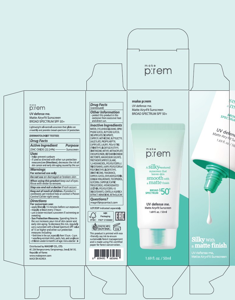 UV Defense me. Matte Airy-Fit Sunscreen by is a Otc medication manufactured, distributed, or labeled by MAGNIF CO., LTD, KOLMAR KOREA CO., LTD.. Drug facts, warnings, and ingredients follow.