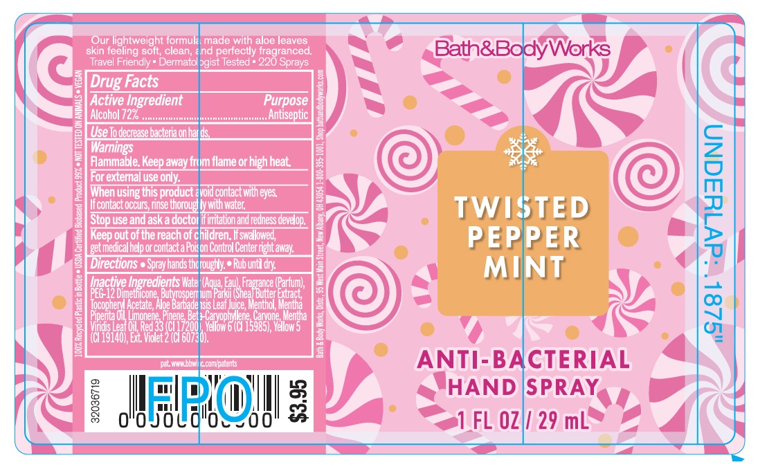 Anti-BacterialHandSpray by is a Otc medication manufactured, distributed, or labeled by Bath & Body Works, Inc., KDC US Holdings, Inc.. Drug facts, warnings, and ingredients follow.