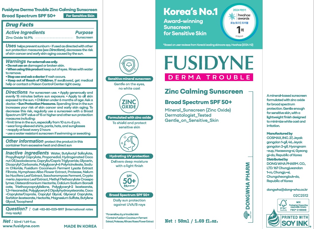 FUSIDYNE DERMA TROUBLE Zinc Calming Sunscreen by is a Otc medication manufactured, distributed, or labeled by DONG WHA PHARM. CO., LTD.. Drug facts, warnings, and ingredients follow.