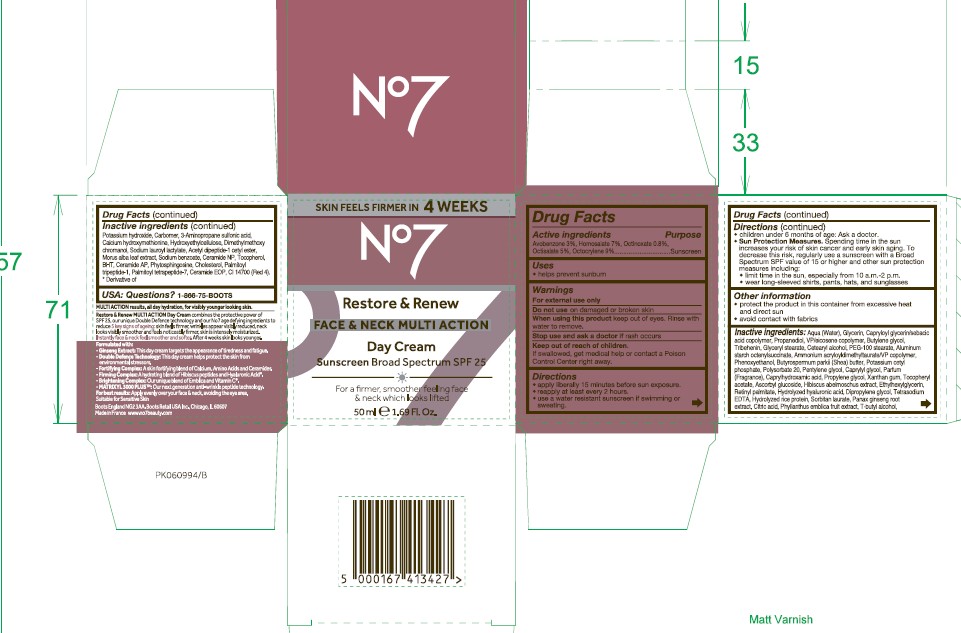 No7 Restore and Renew Multi Action Day Cream Sunscreen Broad Spectrum SPF 25 by is a Otc medication manufactured, distributed, or labeled by BCM Cosmetique SAS, The Boots Company PLC. Drug facts, warnings, and ingredients follow.
