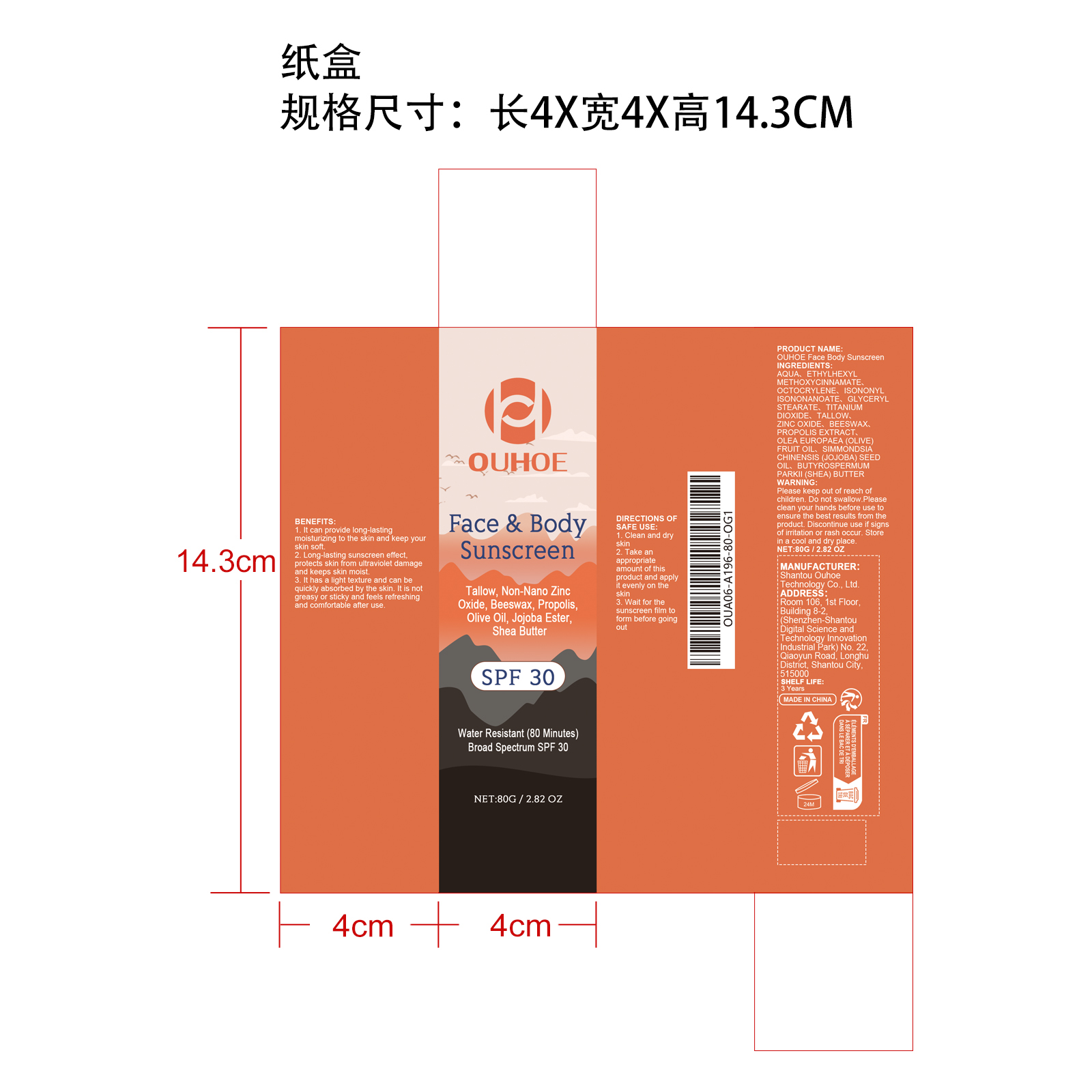 OUHOE Face Body Sunscreen by is a Otc medication manufactured, distributed, or labeled by Shantou Ouhoe Technology Co., Ltd.. Drug facts, warnings, and ingredients follow.