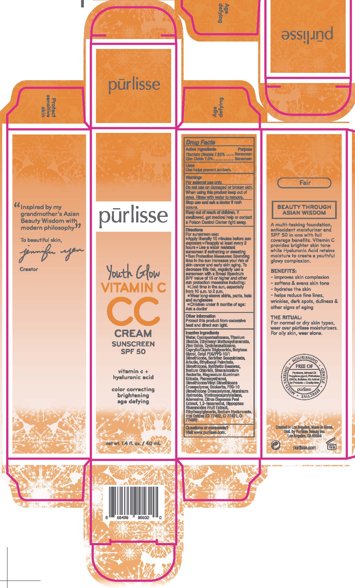 Youth Glow Vitamin C CC Cream Sunscreen SPF 50 - Light by is a Otc medication manufactured, distributed, or labeled by Pur-lisse Beauty, LLC. Drug facts, warnings, and ingredients follow.